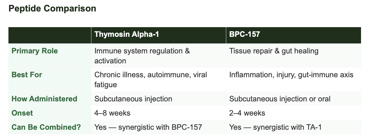 Thymosin Alpha-1 and BPC-157 work on different but complementary aspects of immune health. TA-1 regulates and educates the immune system from the top down — improving how your body identifies and responds to threats. BPC-157 addresses the inflammatory environment from the bottom up — reducing the chronic inflammation that keeps the immune system perpetually overactivated.