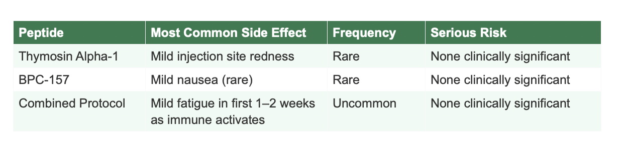 Both Thymosin Alpha-1 and BPC-157 have excellent safety profiles with decades of clinical research behind them. Side effects are rare and mild.